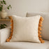 The fabric for the cushion covers with fringes is made by weaving cotton strands intricately, which add a touch of rustic charm to any décor.